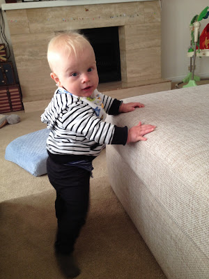 | He's getting VERY good at pulling up to standing and just starting to furniture surf as well - moving along the edges |